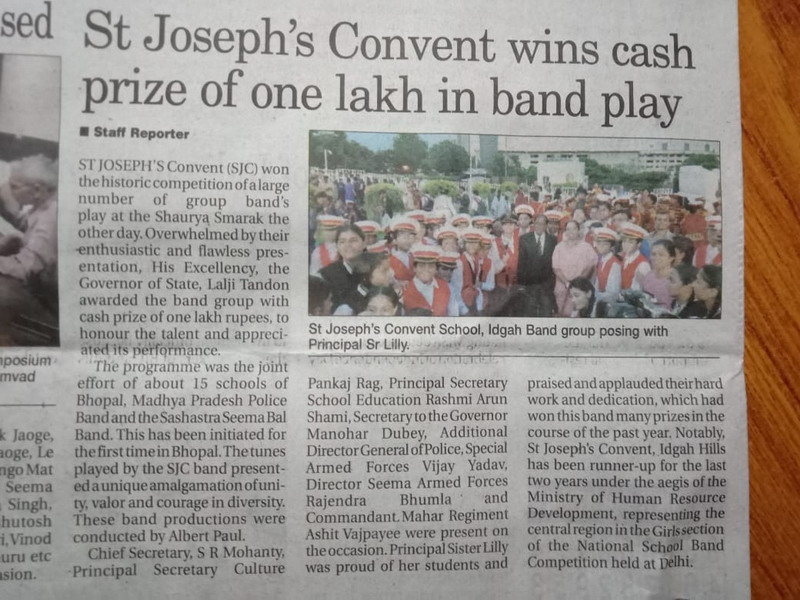 St Joseph’s Convent Sr. Sec. Girls School, Idgah Hills, Bhopal was awarded the first prize with a cash award of ₹ 100,000/- for the band display on August 16, 2019 , a war memorial situated at Bhopal.